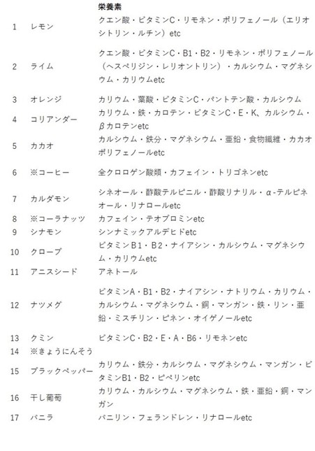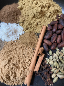 カルダモンやクミン、シナモンと言ったよく知るスパイスの他に、希少性の高いコーラナッツやチョコレートの原料であるカカオ豆なども入っています。
